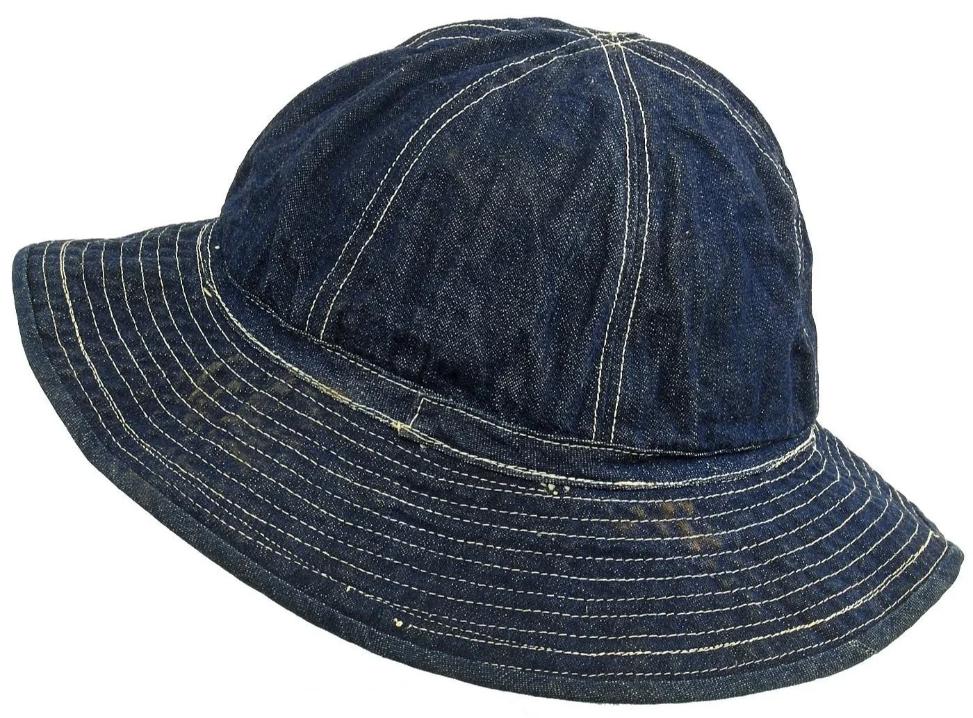 In the 1800’s, denim apparel surged in popularity among the rugged cowboys, miners, and railroad workers of the American West. Denim was not used for headwear, however, until WWI when the U.S. military issued denim uniforms for chore work. The uniforms came complete with a brimmed hat for sun production while laboring outdoors. This brimmed hat, now known as a bucket hat, was the debut form for denim above the collar.