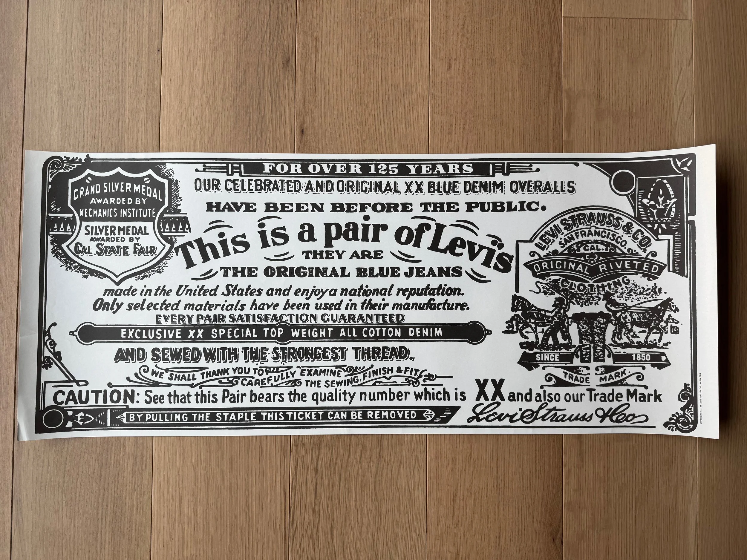 Like the Two Horse back patch, the guarantee ticket was created to defend against rising competition in 1892. The riveted blue jeans patent had expired a few years prior in 1890, and Levi’s was seeing more competitors enter the market. While the purpose of Two Horse patch was brand recognition, the Guarantee ticket was created to emphasis product differentiation. The ticket reassured buyers that “this is a pair” of the real thing, and other jeans were inauthentic copycats. It also challenged customers to inspect the garment, demonstrating confidence that Levi’s jeans are of superior quality over the competition.