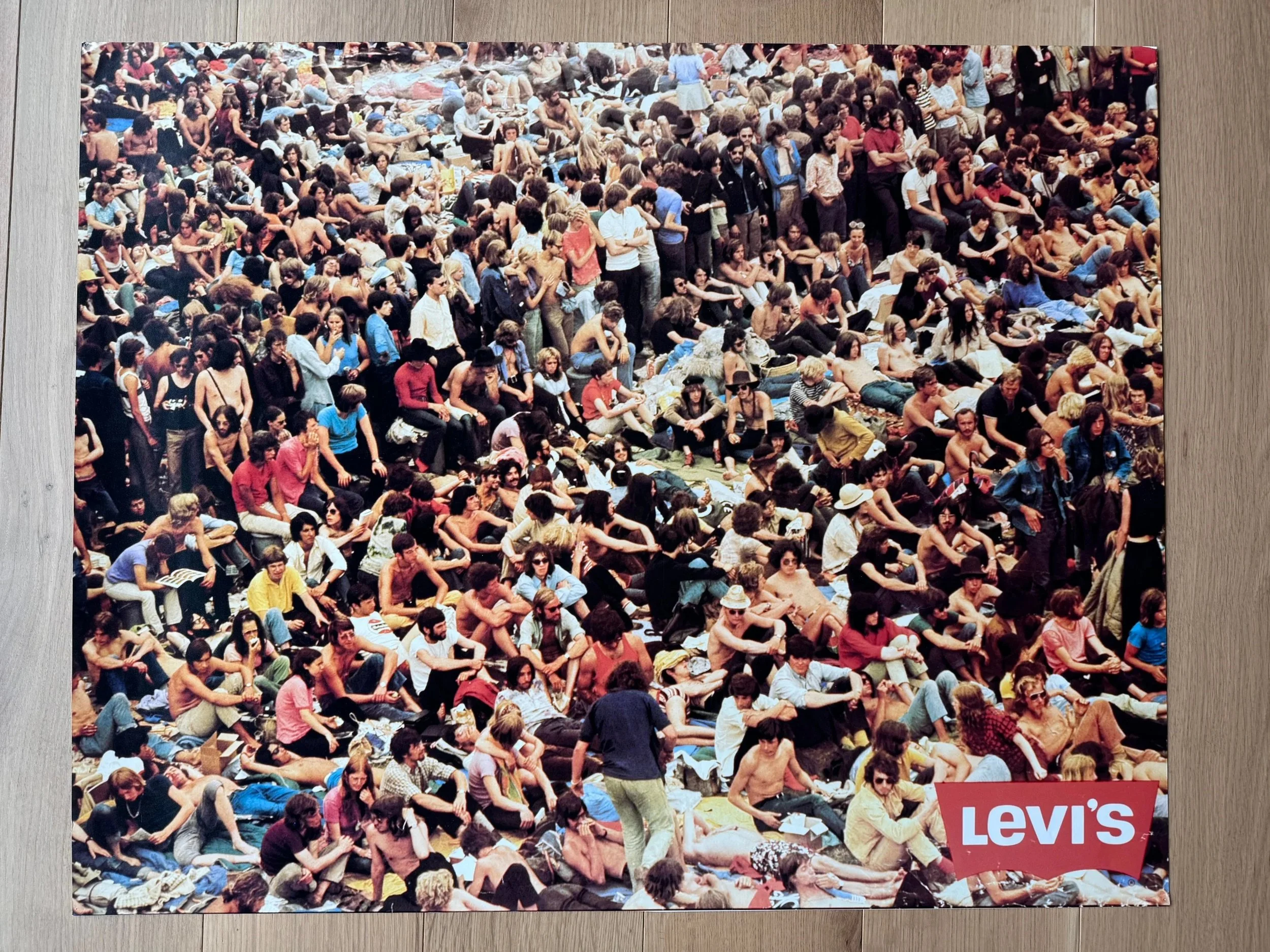 This poster illustrates Levi’s push during the 70’s to expand the brand image beyond workwear and western to lifestyle. The ad sells Levi’s as a lifestyle brand with a single, candid image of personal connection. It’s an authentic moment of enjoyment, showcasing jeans as effortless attire for weekend adventures, roadtrips, outdoor concerts, and everyday life.