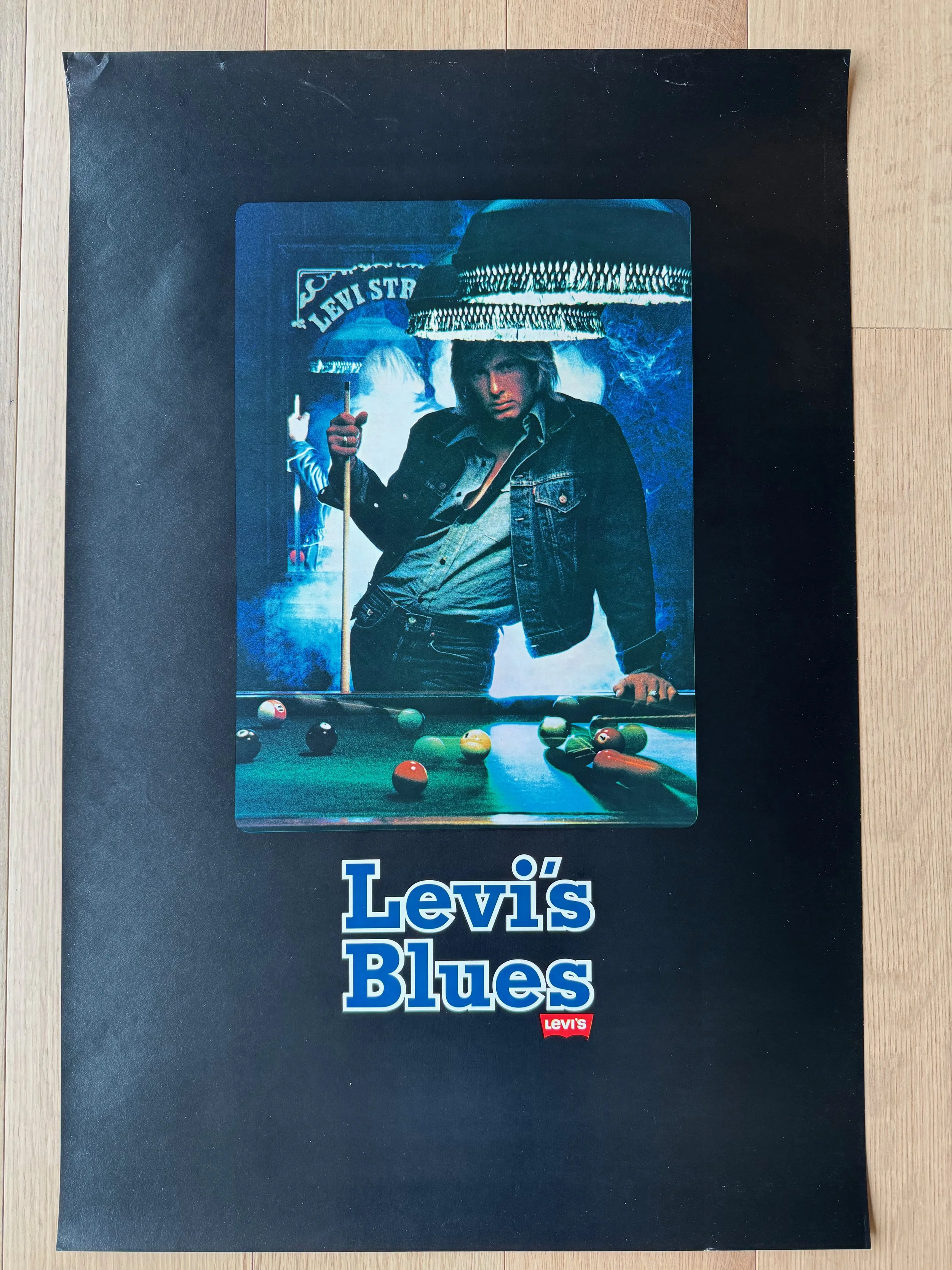 The Levi’s Blues campaign was the precursor to the famous 1984 “501 Blues” television spots. These ads were set to upbeat blues music, and featured people having fun and dancing in their 501 jeans, including then-unknown actors Bruce Willis and Stanley Tucci. The blues, as a genre, connotes authenticity, soul, and Americana. Levi’s, wanting to align with these qualities, created the double entendre to imply that wearing Levi’s is like playing the blues: timeless and genuine. The pool hall setting of this poster is gritty yet appealing, adding a layer of American working-class cool.