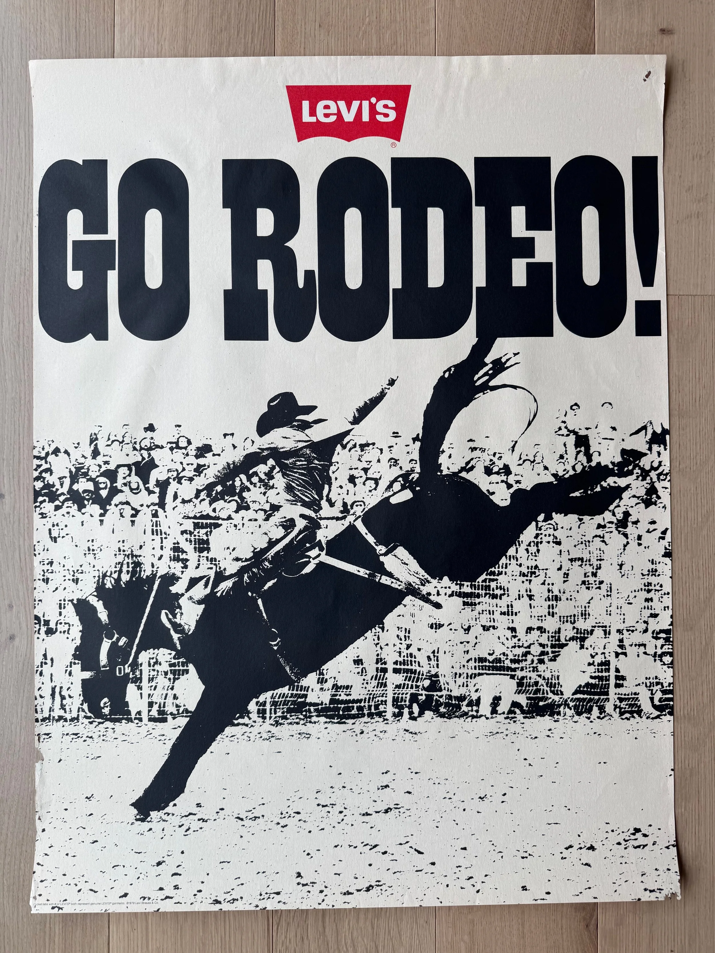 From 1890 to1950, Levi’s was synonymous with American rodeo, and competitions were a major advertising channel for the brand. Levi’s sponsored events, awarding cash prizes and custom belt buckles for trophies. Champion cowboys were featured in advertisements, and western movies featured actors in head-to-toe Levi’s. By the late ’60s, however, Wrangler was emerging as a strong competitor. By mid-70’s, Wrangler had taken over rodeo culture. Levi’s, meanwhile, was focused on capturing the broader youth market, but also worked to retain its long-standing reputation in the cowboy and rodeo domain. As such, the brand continued to sponsor small events and amateur competitions to support the community. This 1978 poster was likely provided to rodeo stores during that era.