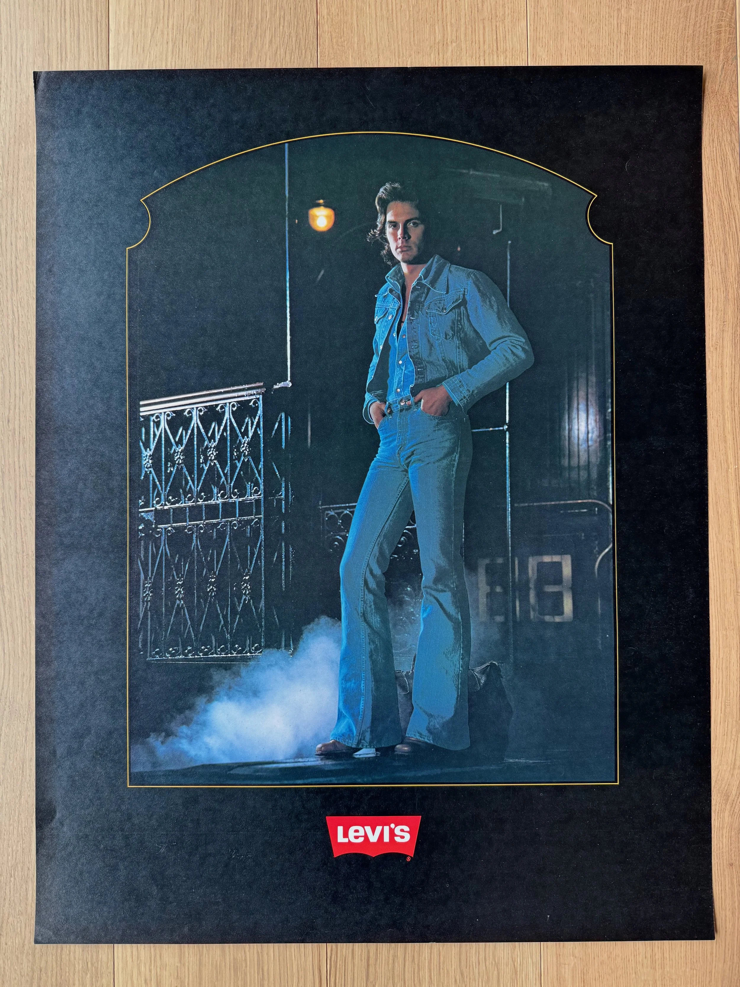 In stark contrast to the natural feel of the “outdoor couple” image, this poster is intentionally theatrical. Unlike the earthy, hippie vibe of the early ’70s, the staged image has an urban, noir vibe to imply that Levi’s jeans can be chic and edgy, not just daytime work/play clothes. At a time when pop culture was fragmenting into sub-scenes (glam-rock, disco, etc), Levi’s sought a place in the urban nightlife and glamour vibe. Successfully, Levi’s managed to stay relevant across the board.