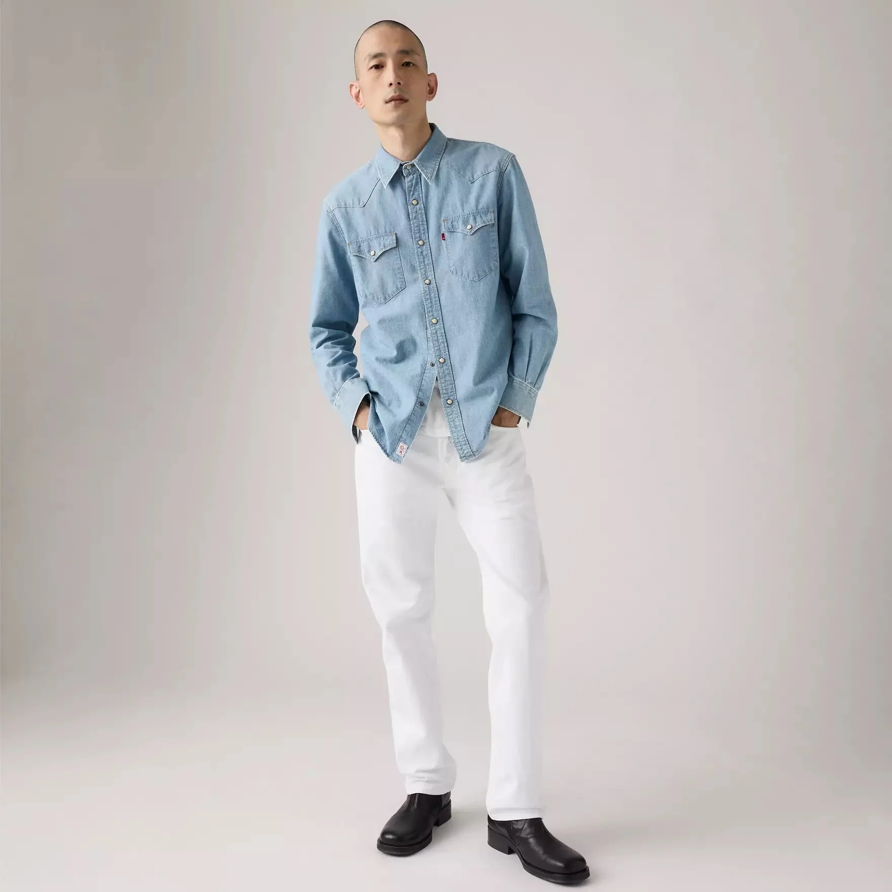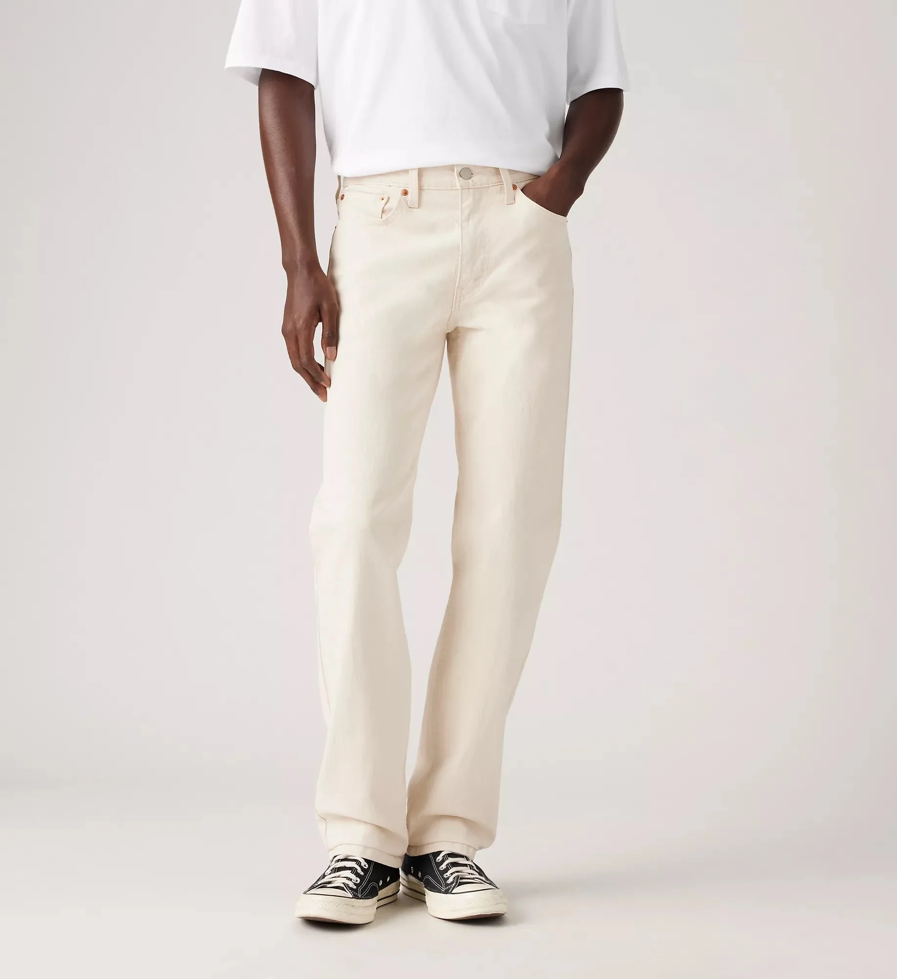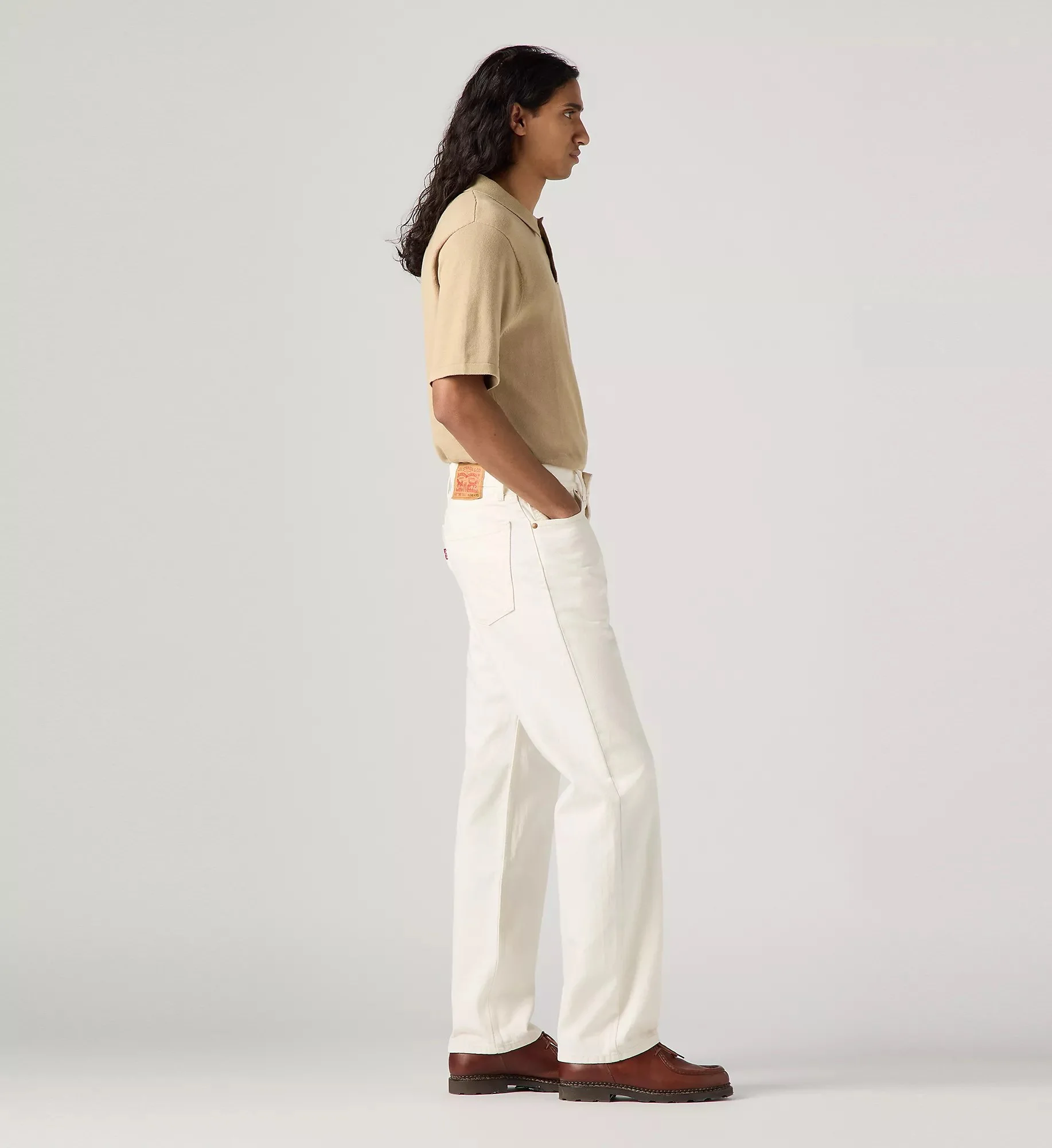 The archetype. If you want white jeans with cultural gravitas, start here—straight through the hip, button fly, and that iconic rise that never dates. Pair with a chambray shirt for high/low texture play.