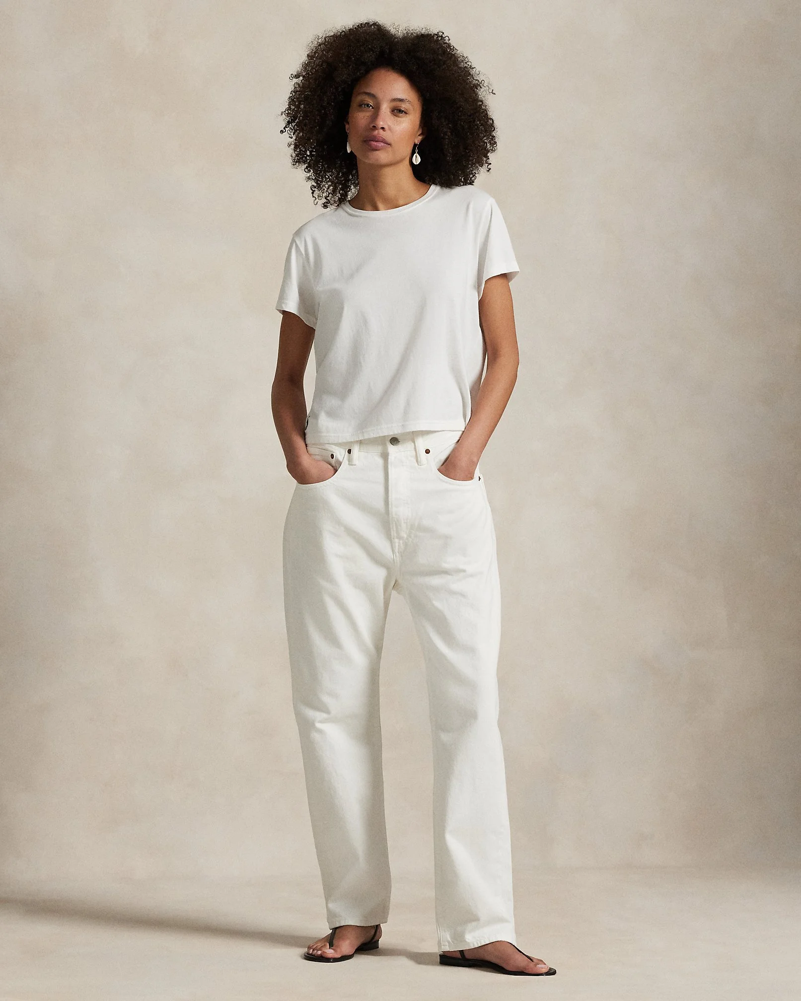A modern straight with a slightly lower rise than 501s and an easy leg that teams well with sneakers or Chelseas. If you prefer a cleaner line under blazers, this is the white jean to reach for.